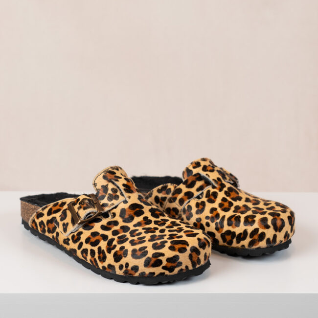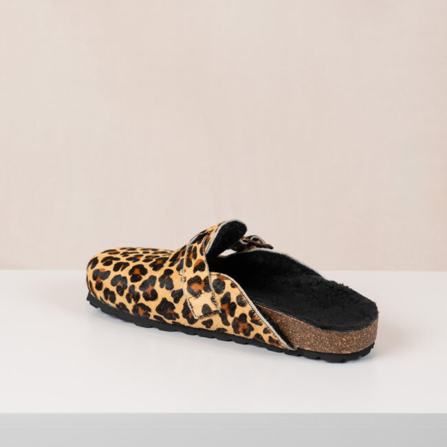 Zueco ajustable elaborado con piel de pelo corto en estampado leopardo.Interior de pelo de borreguillo color negro.
