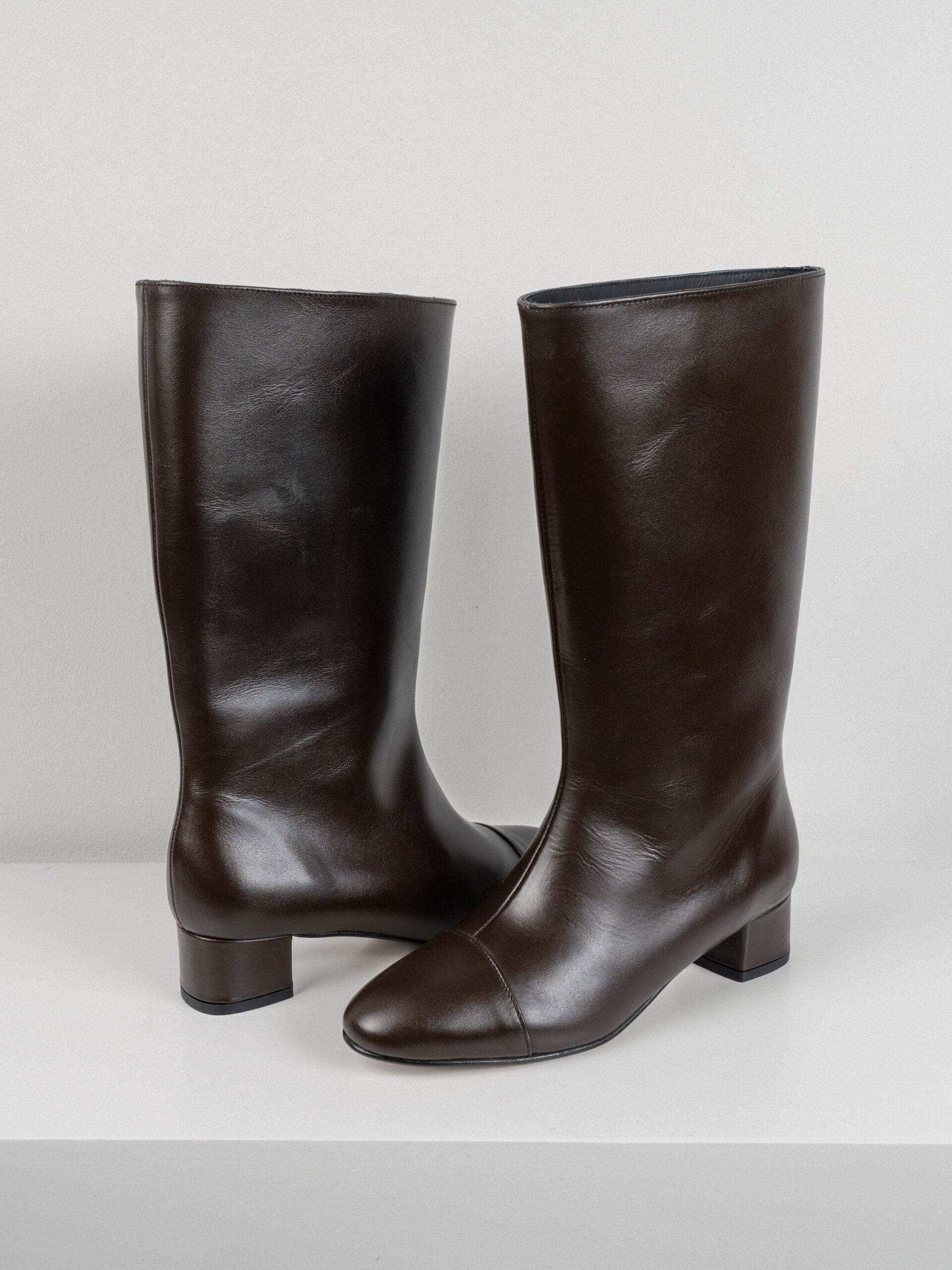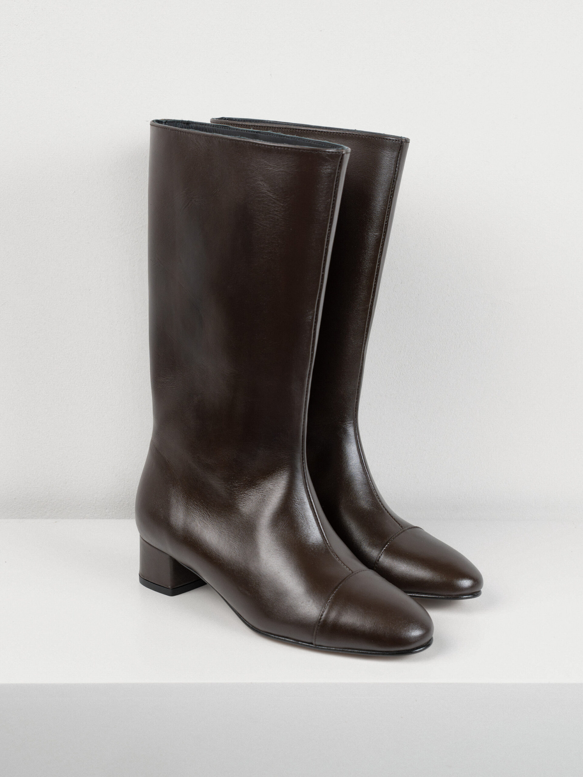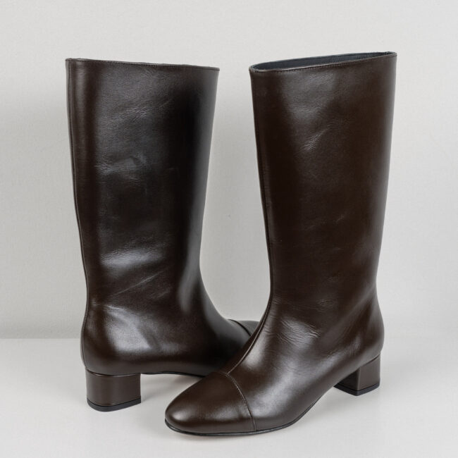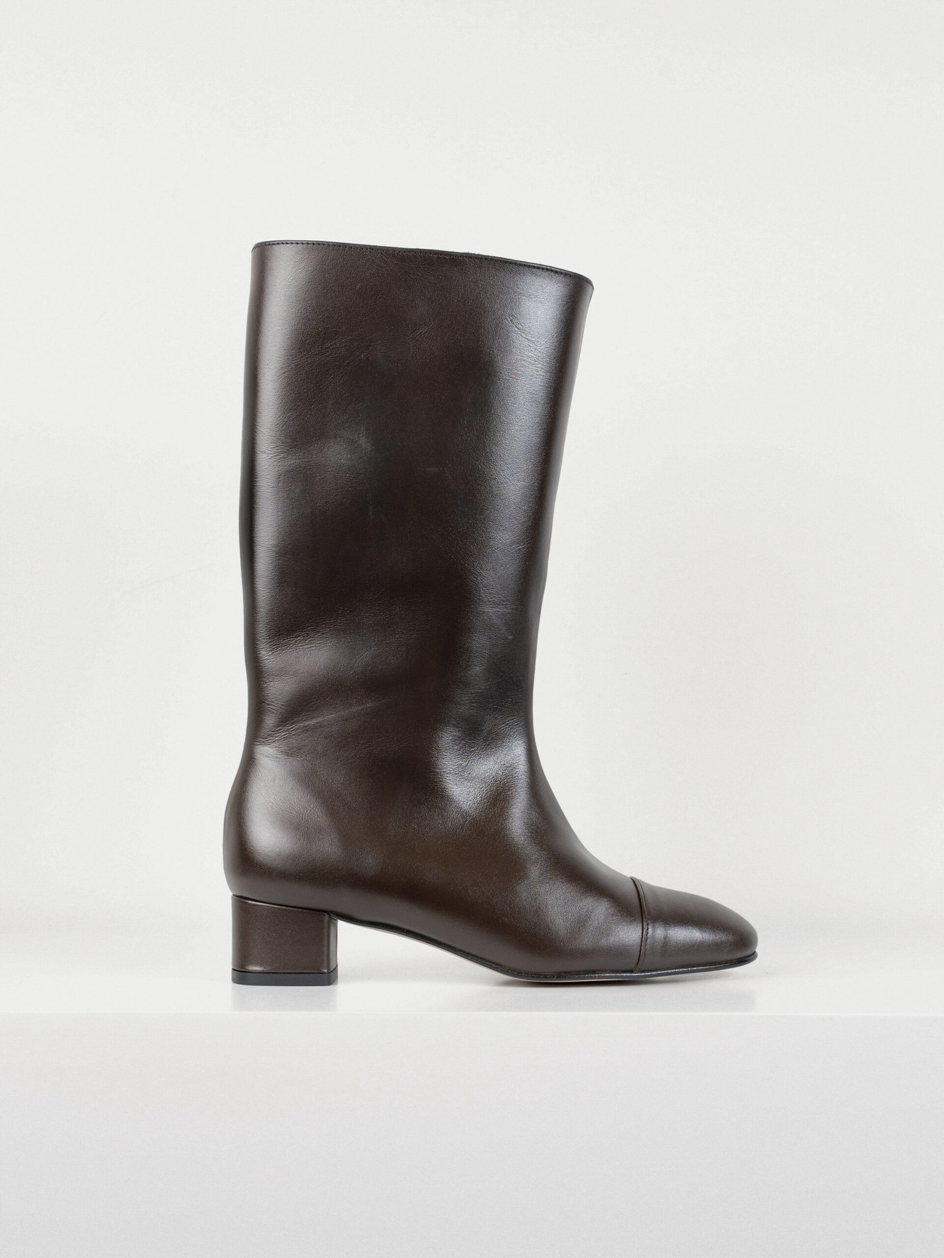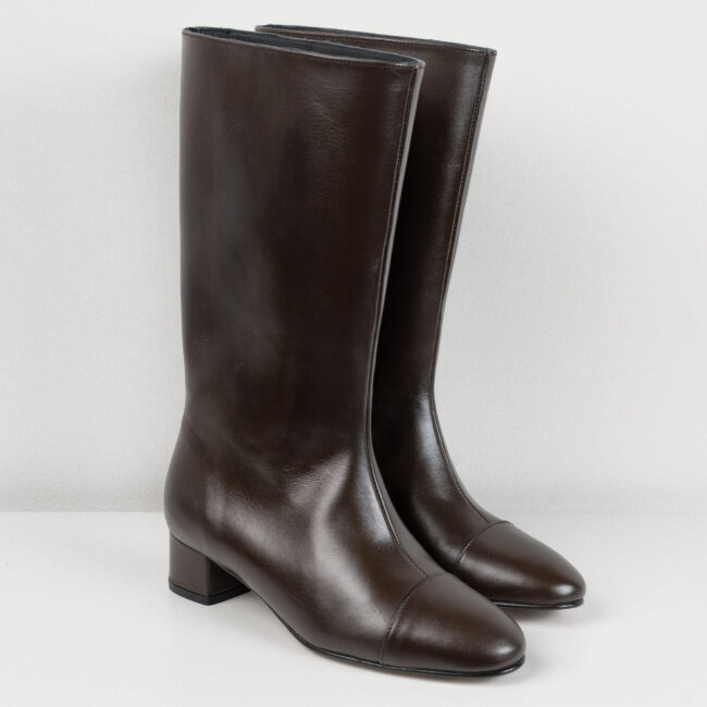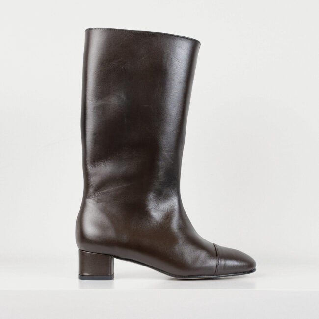Bota de caña alta con un tacón de 4,5cm elaborada en piel chocolate.Cuenta con una plantilla de doble gel que ofrece una comodidad extra. Lo que mas nos gusta de este modelo es el contraste entre materiales así como la elegancia que te aportará a todos tus looks. Diseñado y fabricado integramente en España