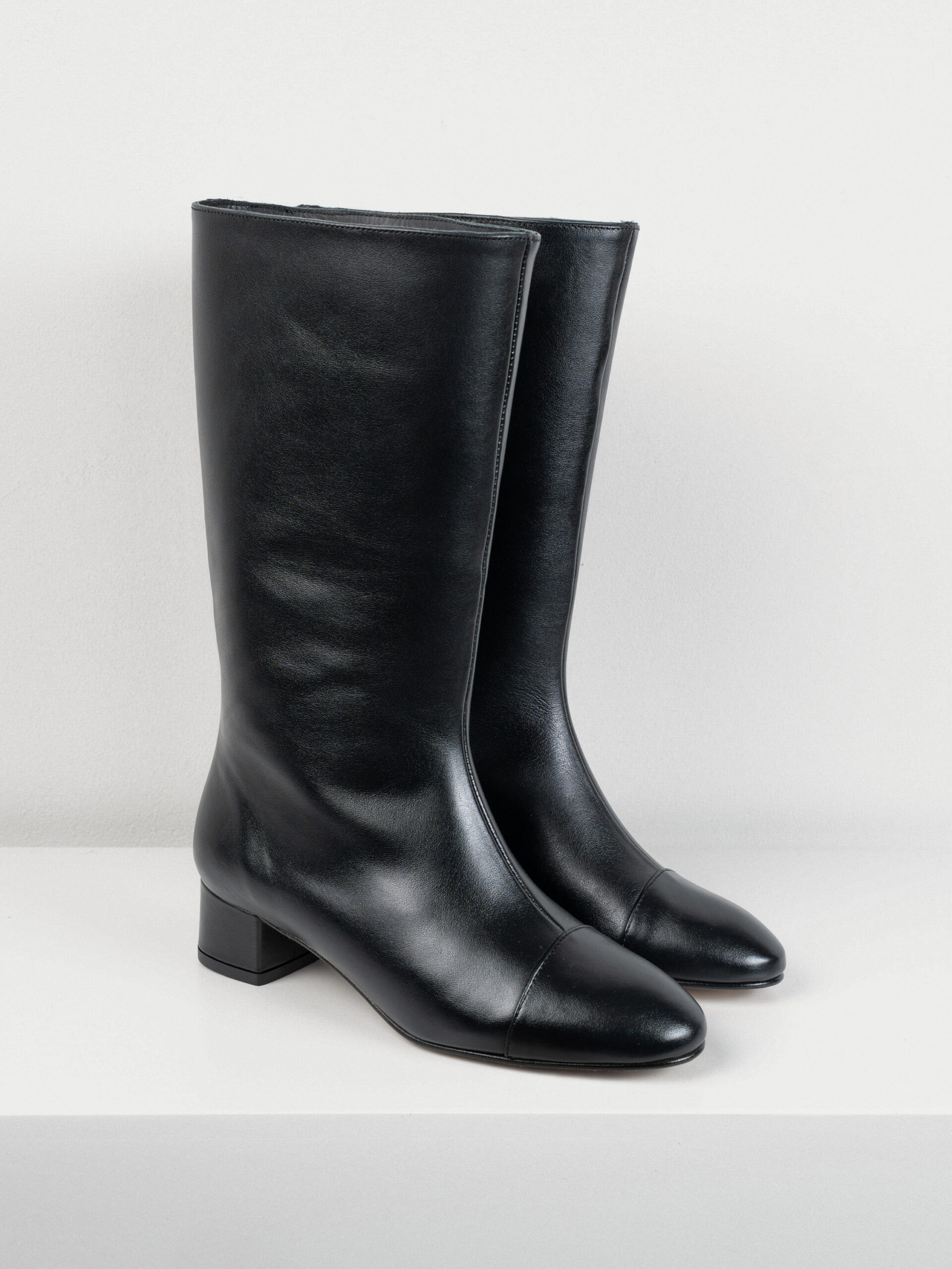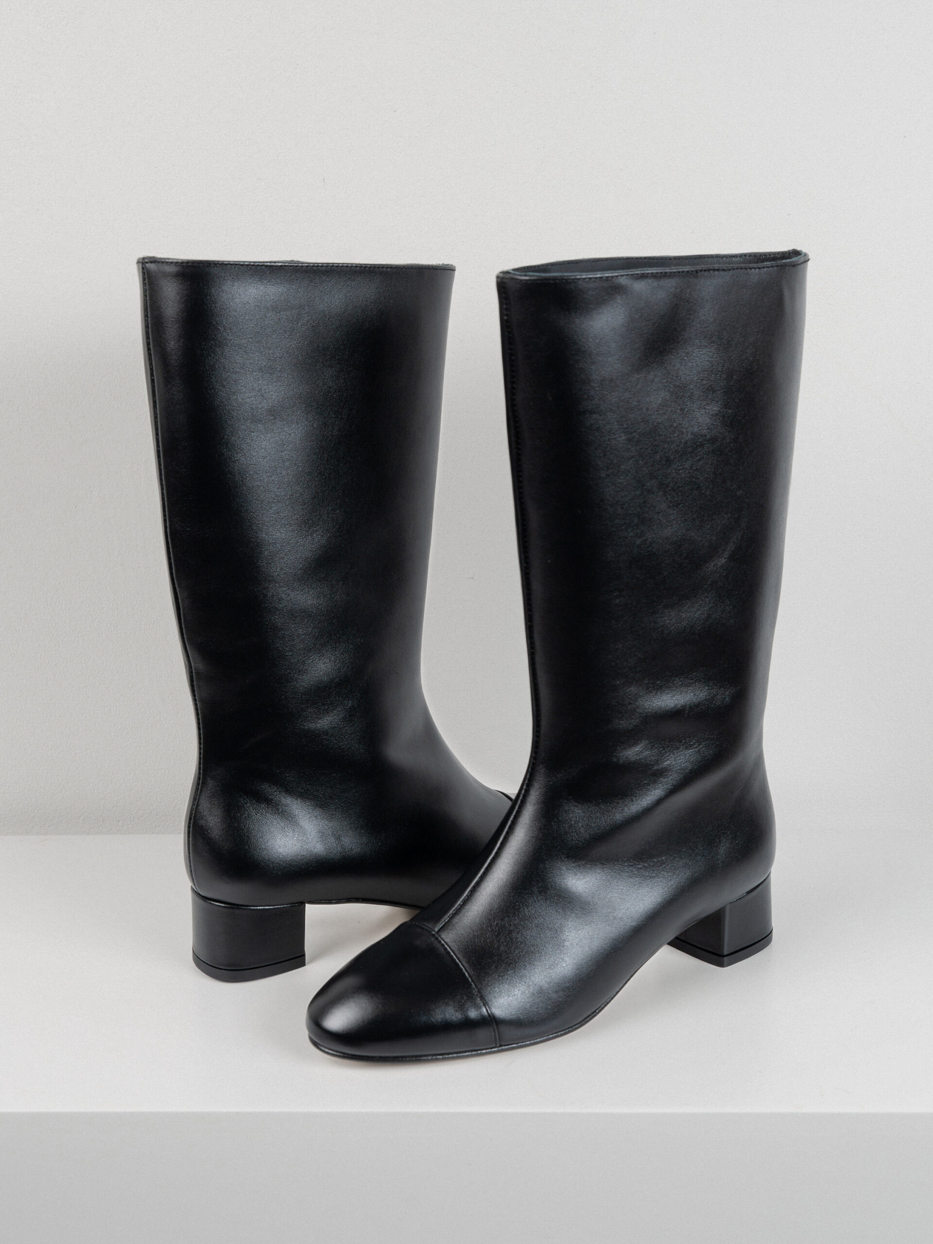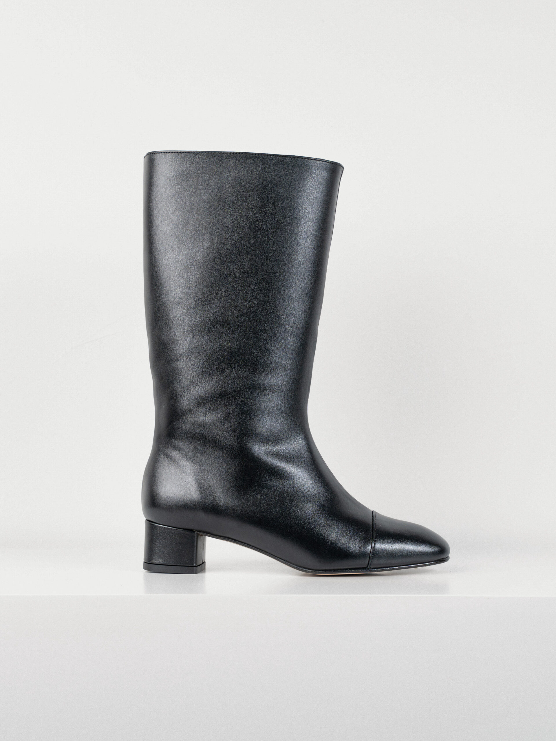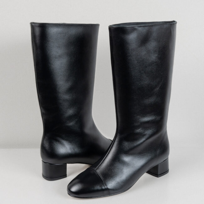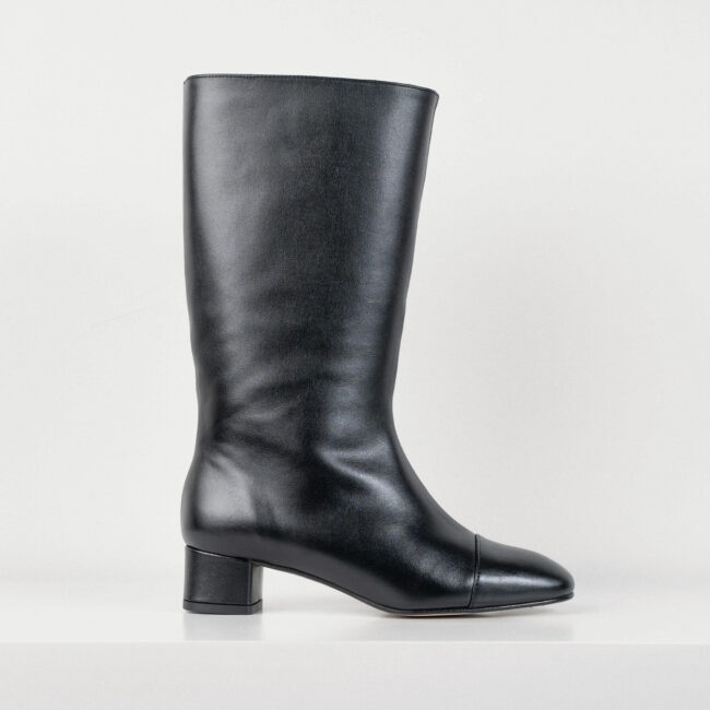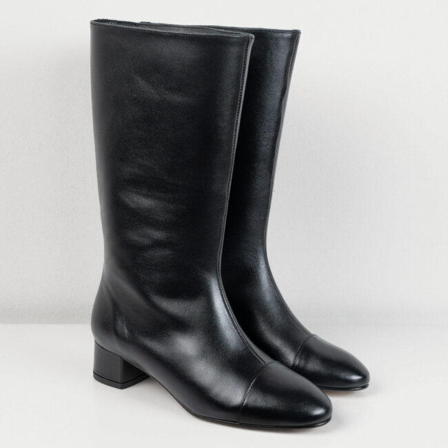Bota de caña alta con un tacón de 4,5cm elaborada en pie negro.Cuenta con una plantilla de doble gel que ofrece una comodidad extra.