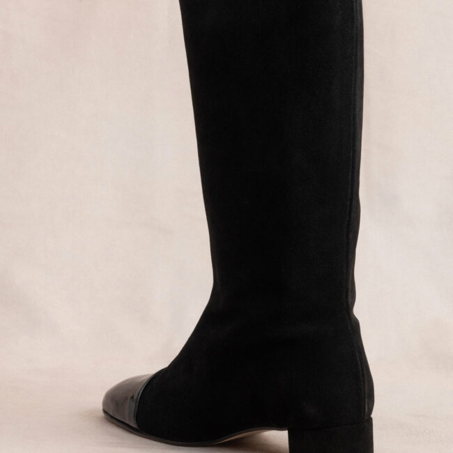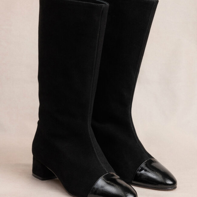 Bota de caña alta con un tacón de 4,5cm elaborada en ante y charol ambos negros.Cuenta con una plantilla de doble gel que ofrece una comodidad extra.