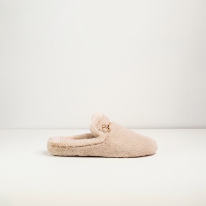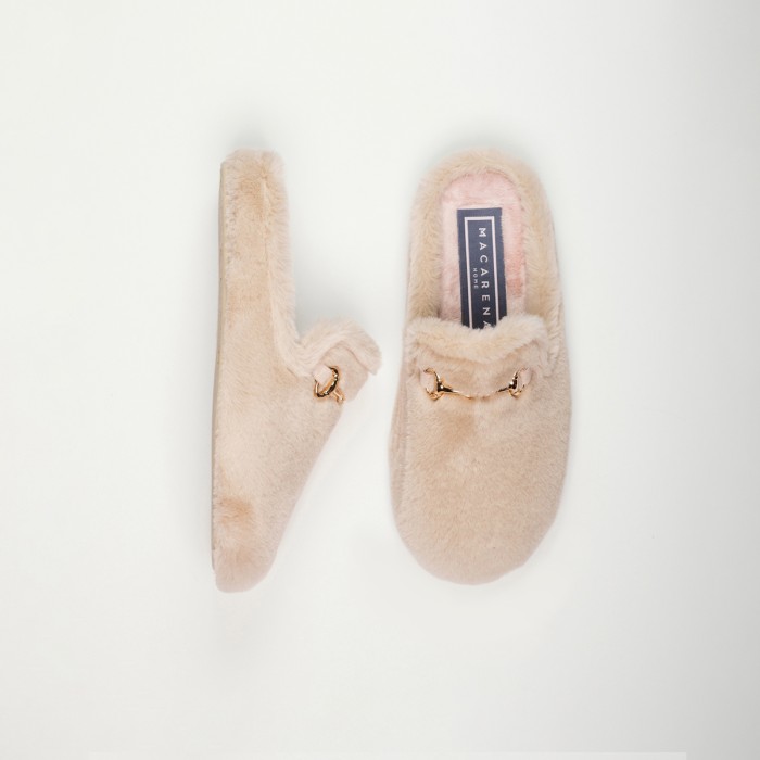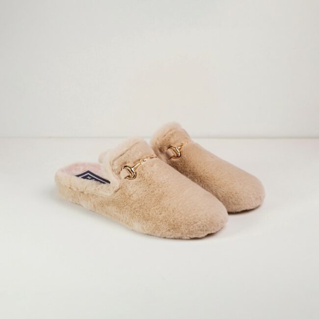 Zapatilla abierta con suela de goma antideslizante. Elaborada con pelo suave y sintético, tipo peluche. Este modelo es de color beige Lo que más nos gusta de estas zapatillas es lo calentitas que son y su diseño acogedor y sofisticado. Fabricadas en España.