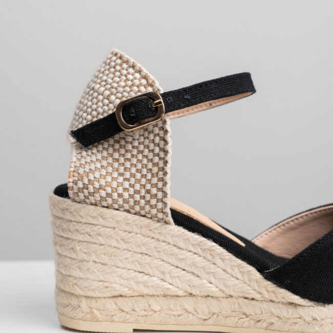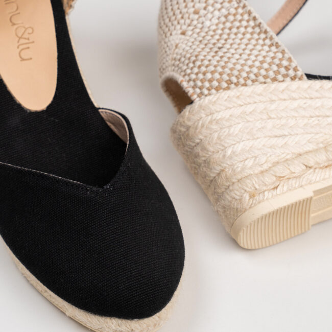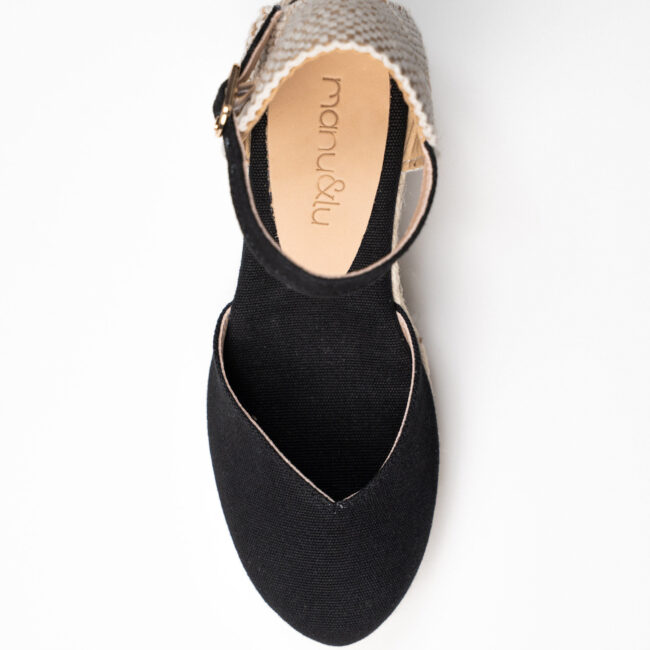Alpargata de pulsera fabricada en lona 100% natural color Negro. Escote en v, cuña de 7 cm y plataforma de 2cm. Interior forrado en piel. Plantilla de doble gel forrada en lona con una lágrima de piel en tono natural. Lo que más nos gusta de Daniela es su corte en v, que favorece a todo el mundo, así como el estilo que aporta con vestidos y shorts. Diseñado y fabricado integramente en España por los mejores artesanos con técnicas tradicionales.