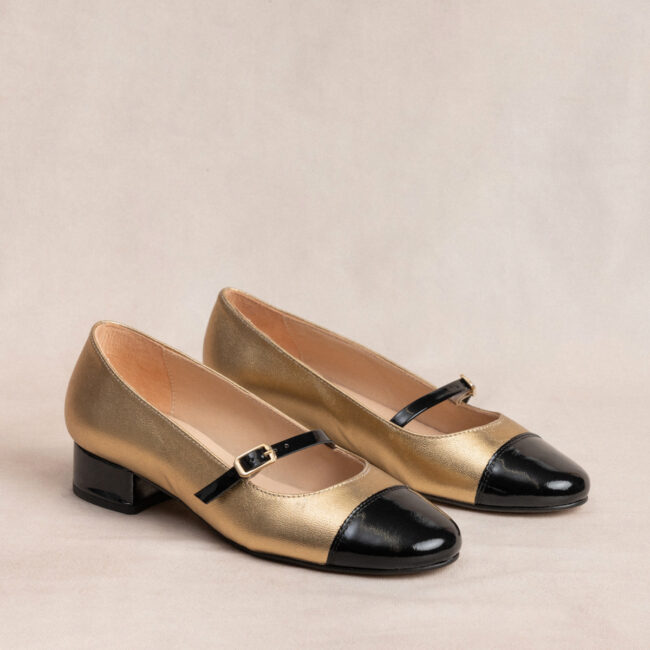 Mary Jane combinada con piel color Oro y charol Negro. Tiene un tacón de 3'5cm. Para una mayor comodidad la tira cuenta con un elástico y se puede ajustar. Presentan una plantilla de doble gel para una mayor amortiguación.
