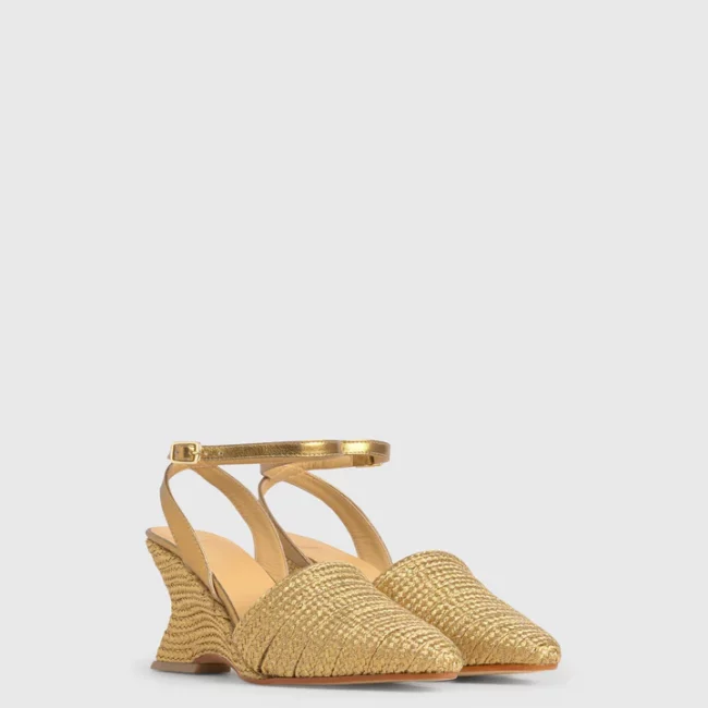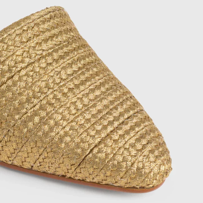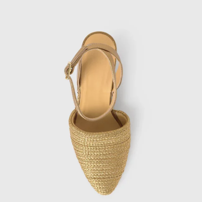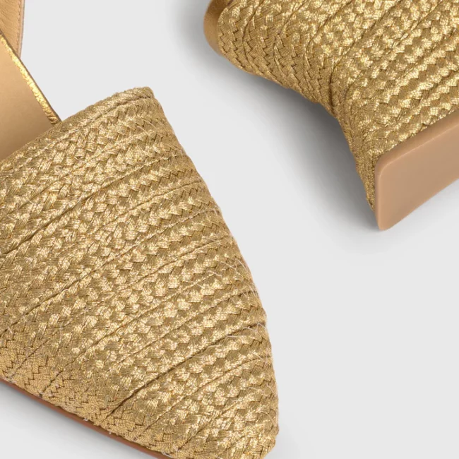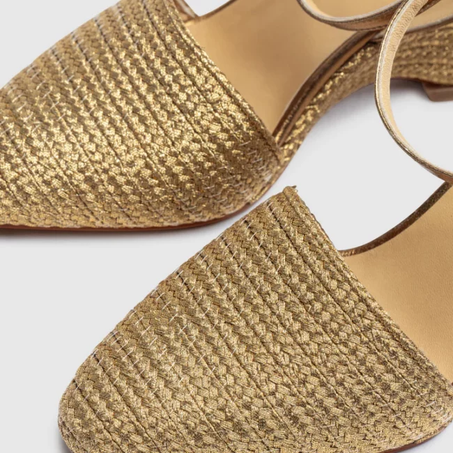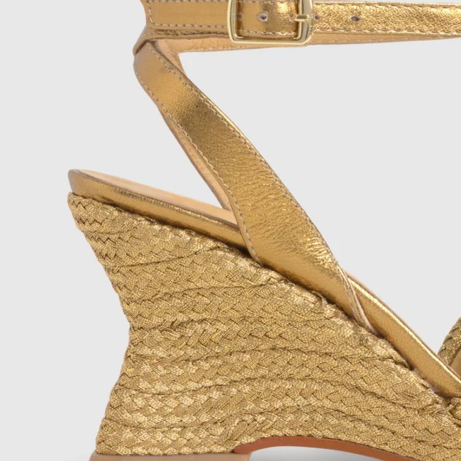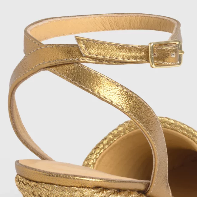 Alpargata Julia con trenzado metalizado artesanal, cierre de pulsera, plantilla acolchada y punta afilada. Cuña de 8cm forrada a juego.