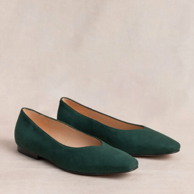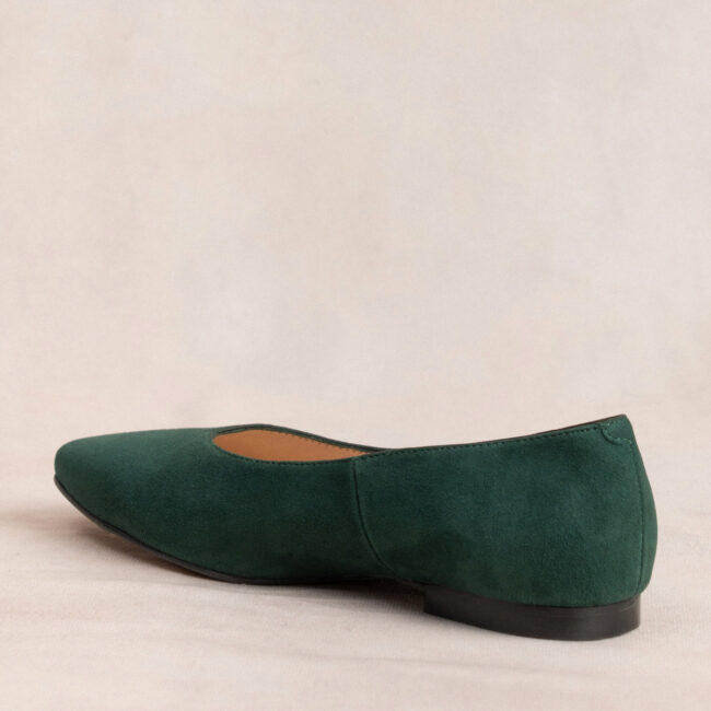 Bailarina escotada tipo v elaborada en ante color Verde Alga . Plantillas acolchadas de doble gel para aportar mayor comodidad.   Lo que más nos gusta de este zapato es su estilo minimalista que elevará tus looks del día a día.   Diseñado y fabricado integramente en España.