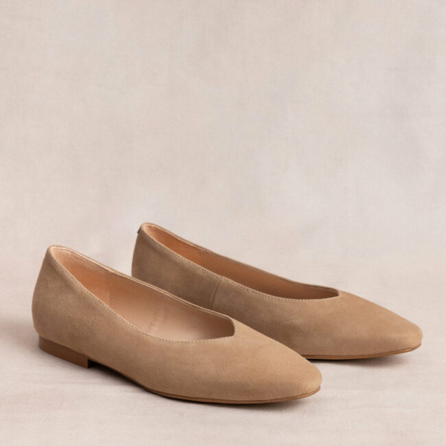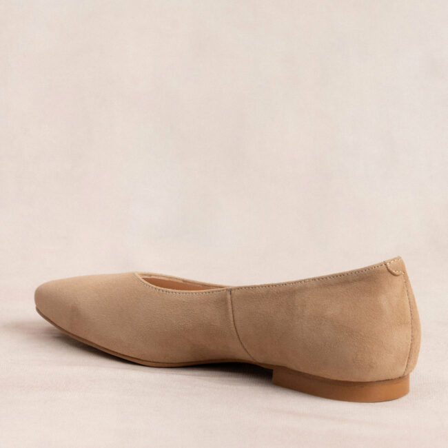 Bailarina escotada tipo v elaborada en ante color Camel. Plantillas acolchadas de doble gel para aportar mayor comodidad.