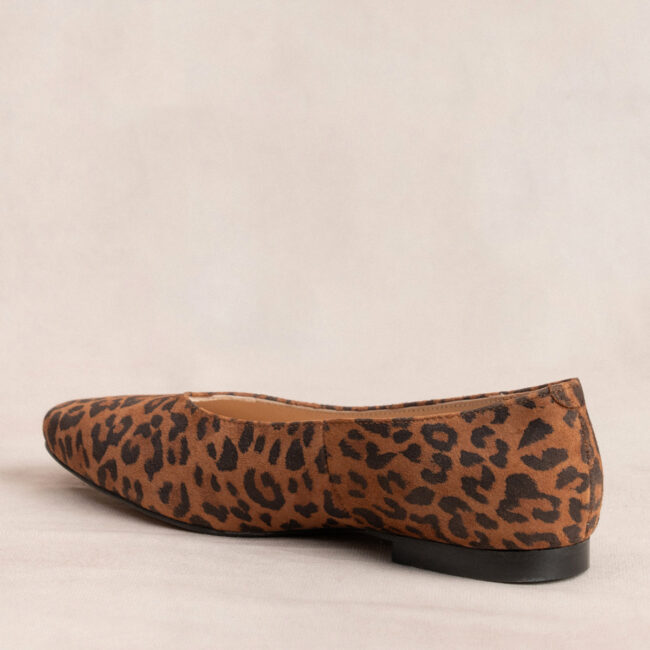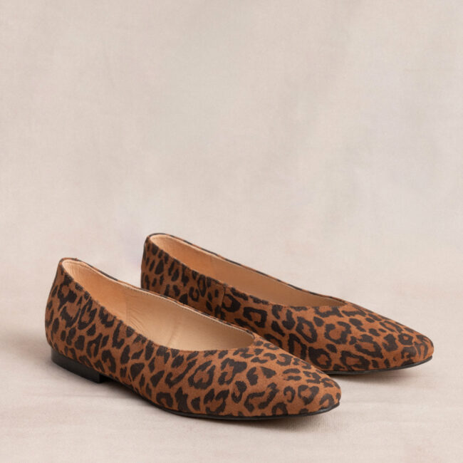 Bailarina escotada tipo v elaborada en ante con estampado Leopardo. Plantillas acolchadas de doble gel para aportar mayor comodidad.