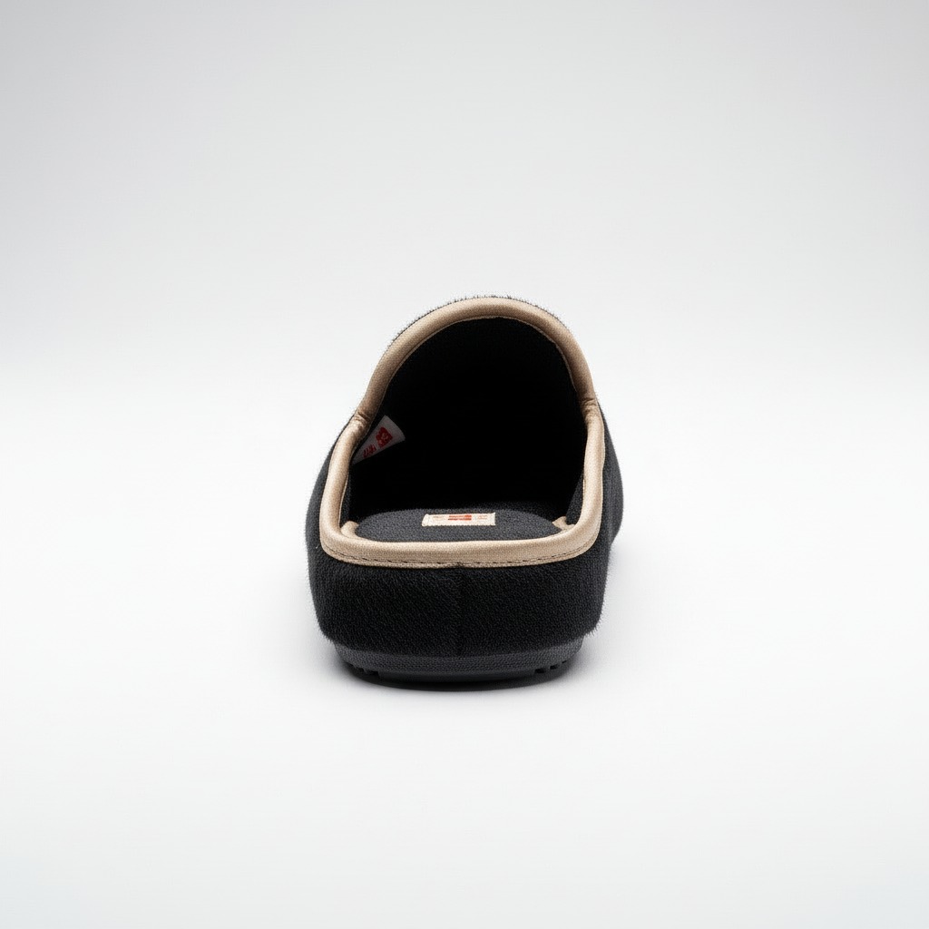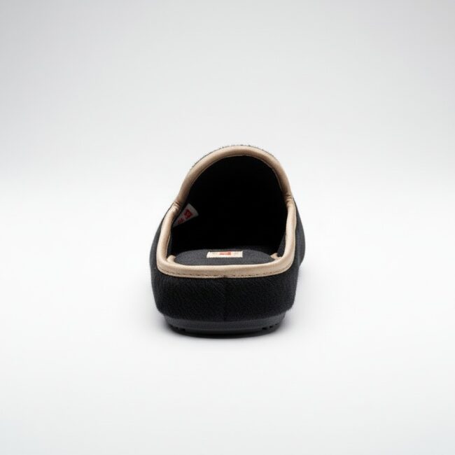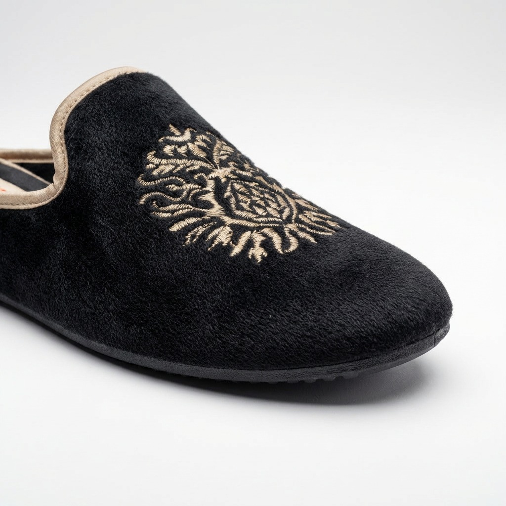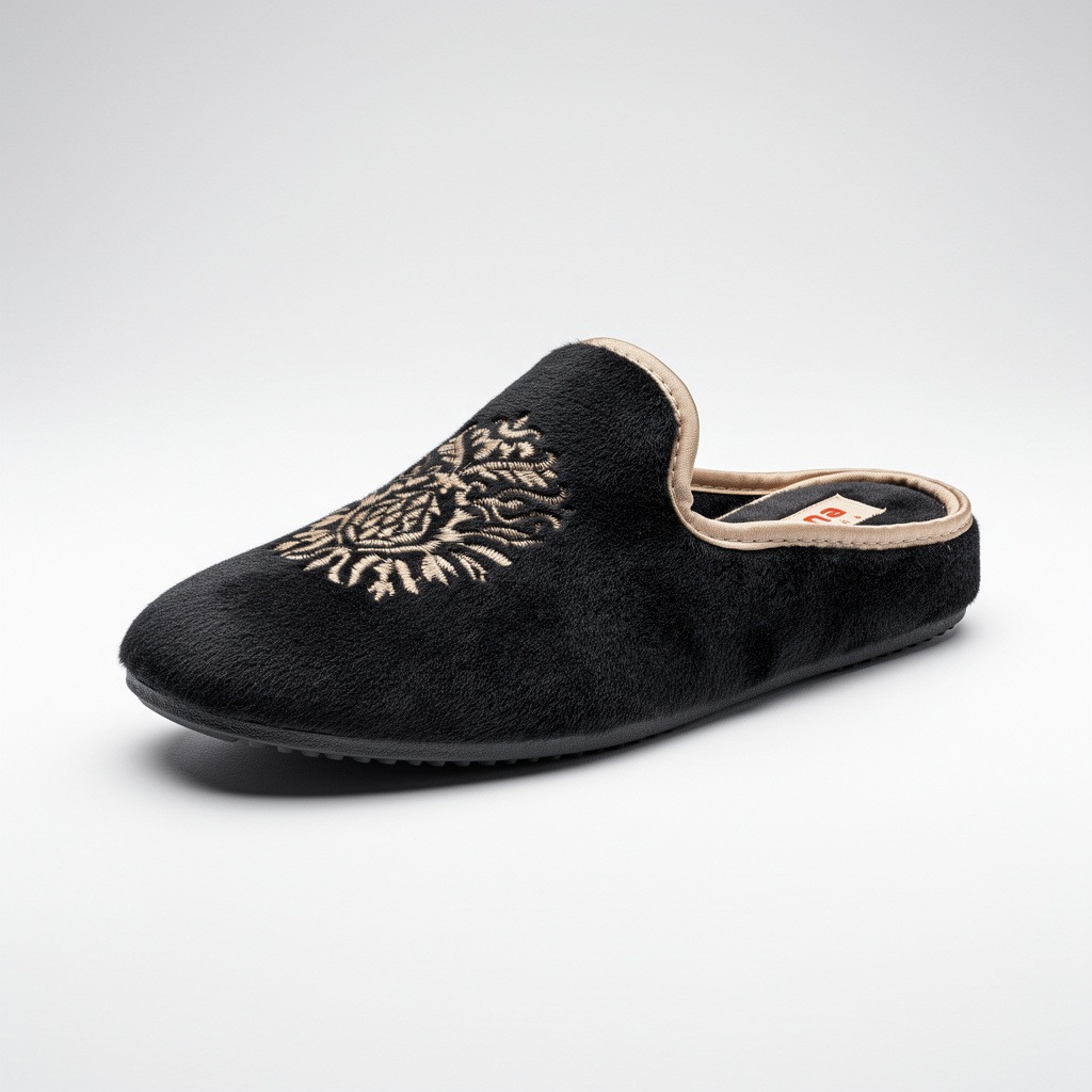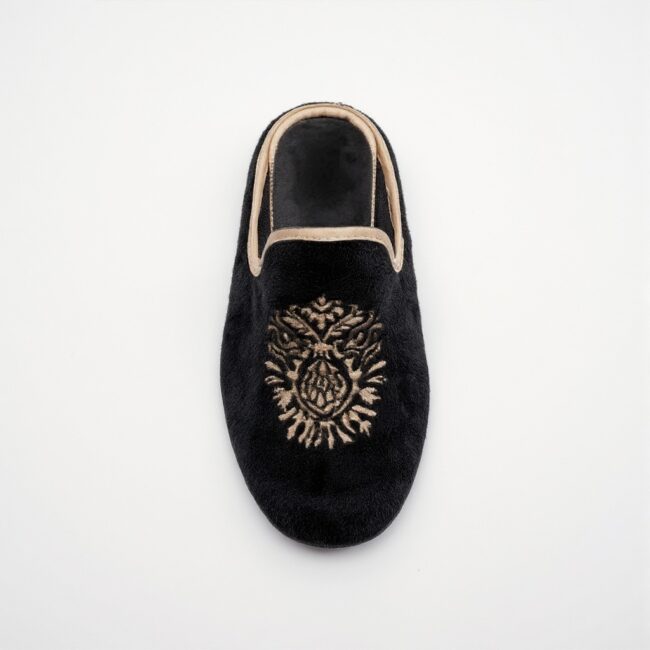 Zapatilla de casa destalonada, elaborada en terciopelo , lleva un escudo bordado. La suela es de goma antideslizante y tiene una pequeña cuña de 3cm.