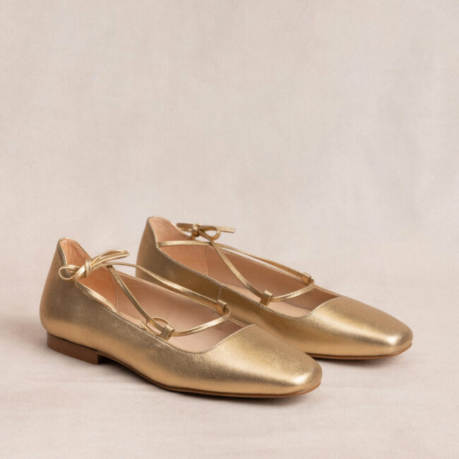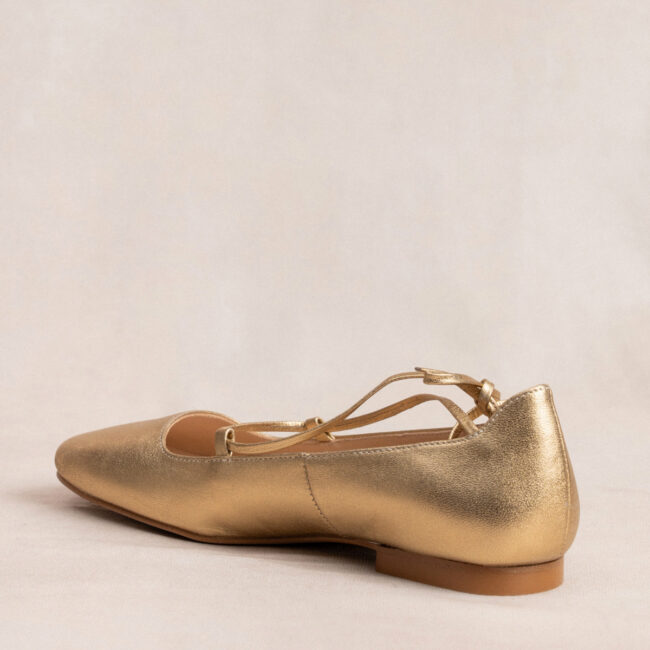 Bailarina con tiras de piel color Dorado. Presenta plantillas de doble gel e interior de piel para una mayor comodidad. Las tiras se cruzan y se atan en el tobillo.   Lo que más nos gusta es el estilo romántico y único que aporta a nuestros looks.   Diseñado y fabricado integramente en España.