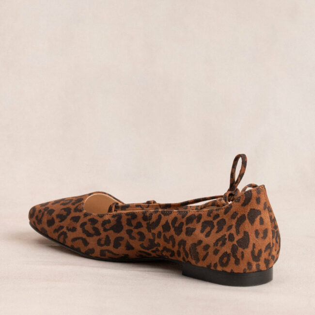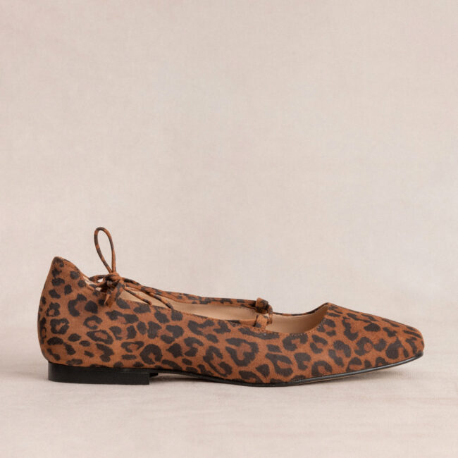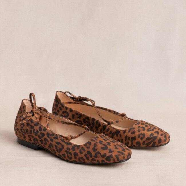 Bailarina con tiras de piel con estampado Leopardo. Presenta plantillas de doble gel e interior de piel para una mayor comodidad. Las tiras se cruzan y se atan en el tobillo.