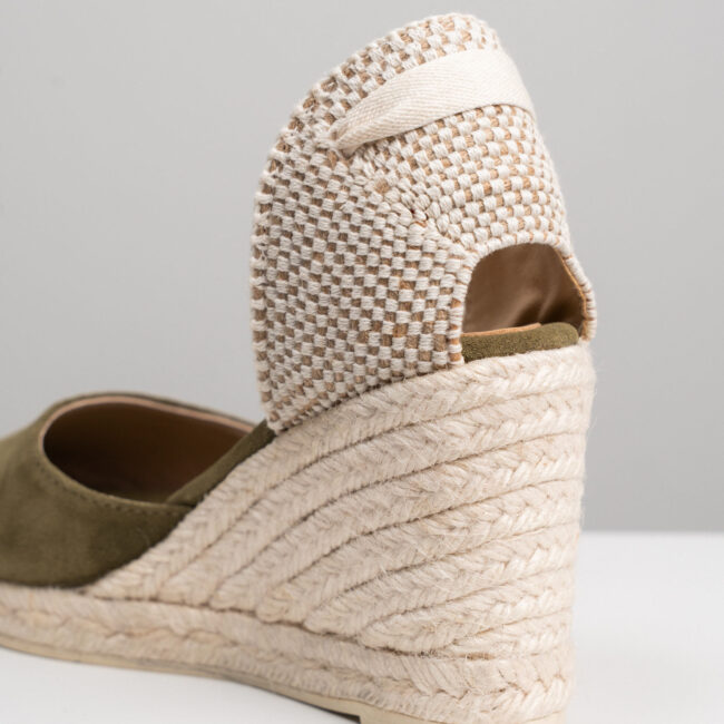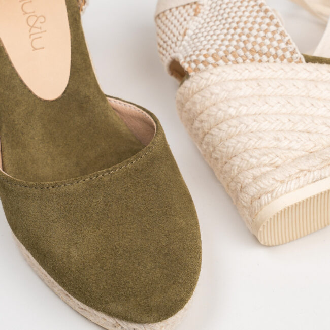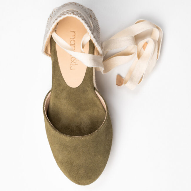 Alpargata de cintas fabricada en ante color Verde. Escote en v, cuña de 9 cm y plataforma de 2cm. Interior forrado en piel. Plantilla de doble gel forrada en lona con una lágrima de piel en tono natural.
