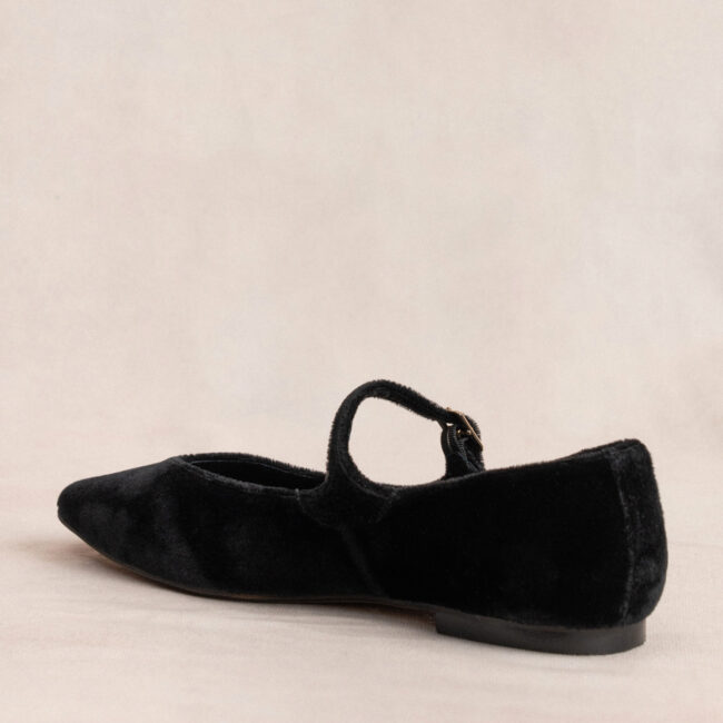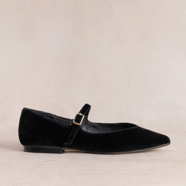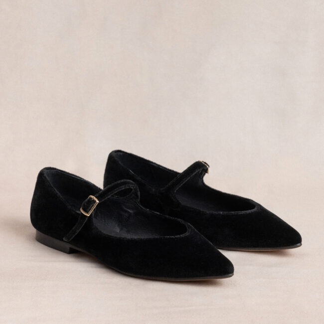 Bailarina con hebilla elaborada en terciopelo de color Negro. Plantilla de doble gel que ofrece una comodidad extra.