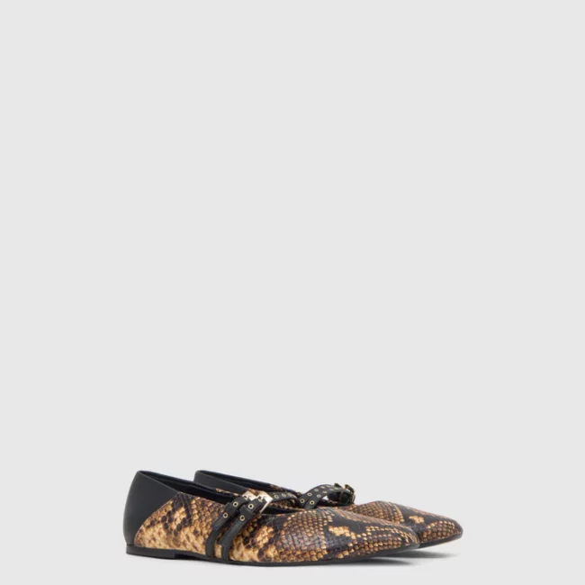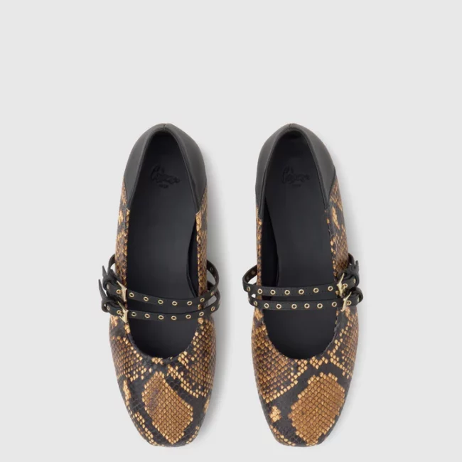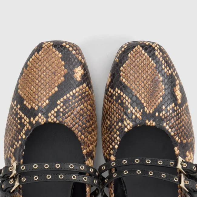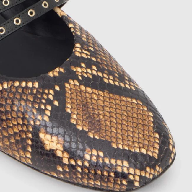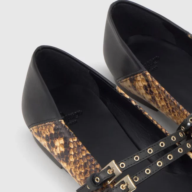 Bailarina plana Sabina en napa combinada: estampada efecto serpiente y lisa en contraste, doble pulsera de cuero, plantilla acolchada y suela de cuerolite.