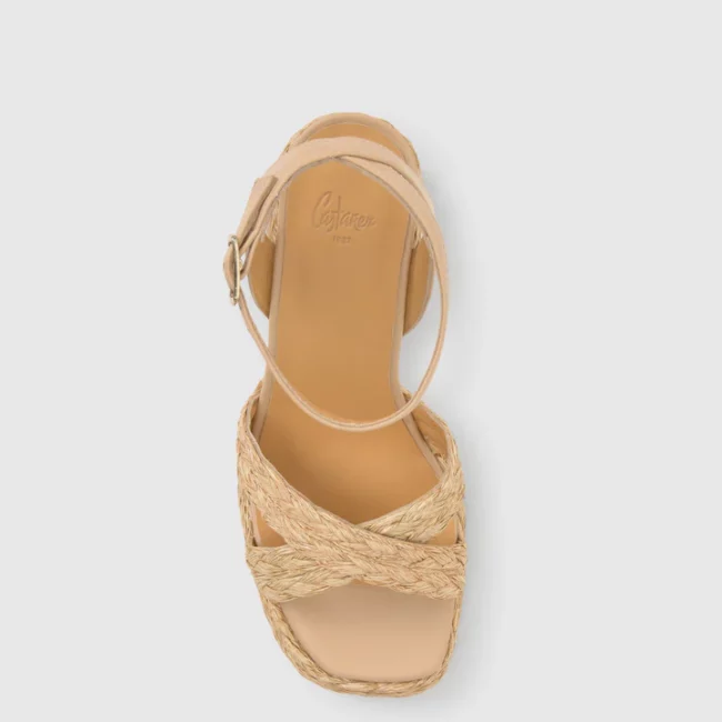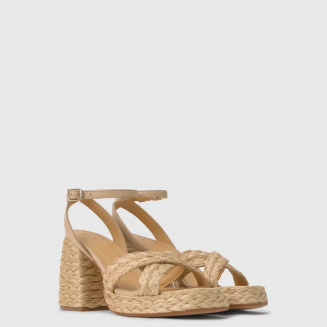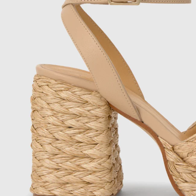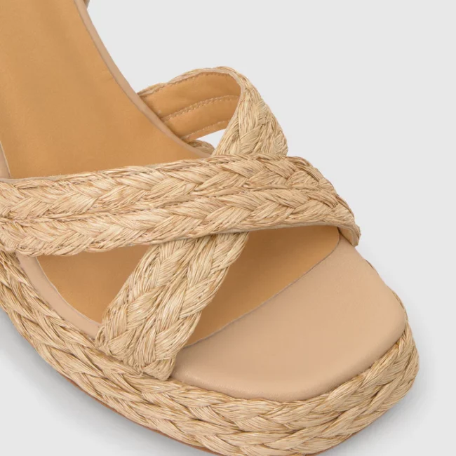 Sandalia Valeriette en rafia natural con cierre de pulsera, plantilla acolchada, escote en V y tacón de 10 cm forrado a juego.